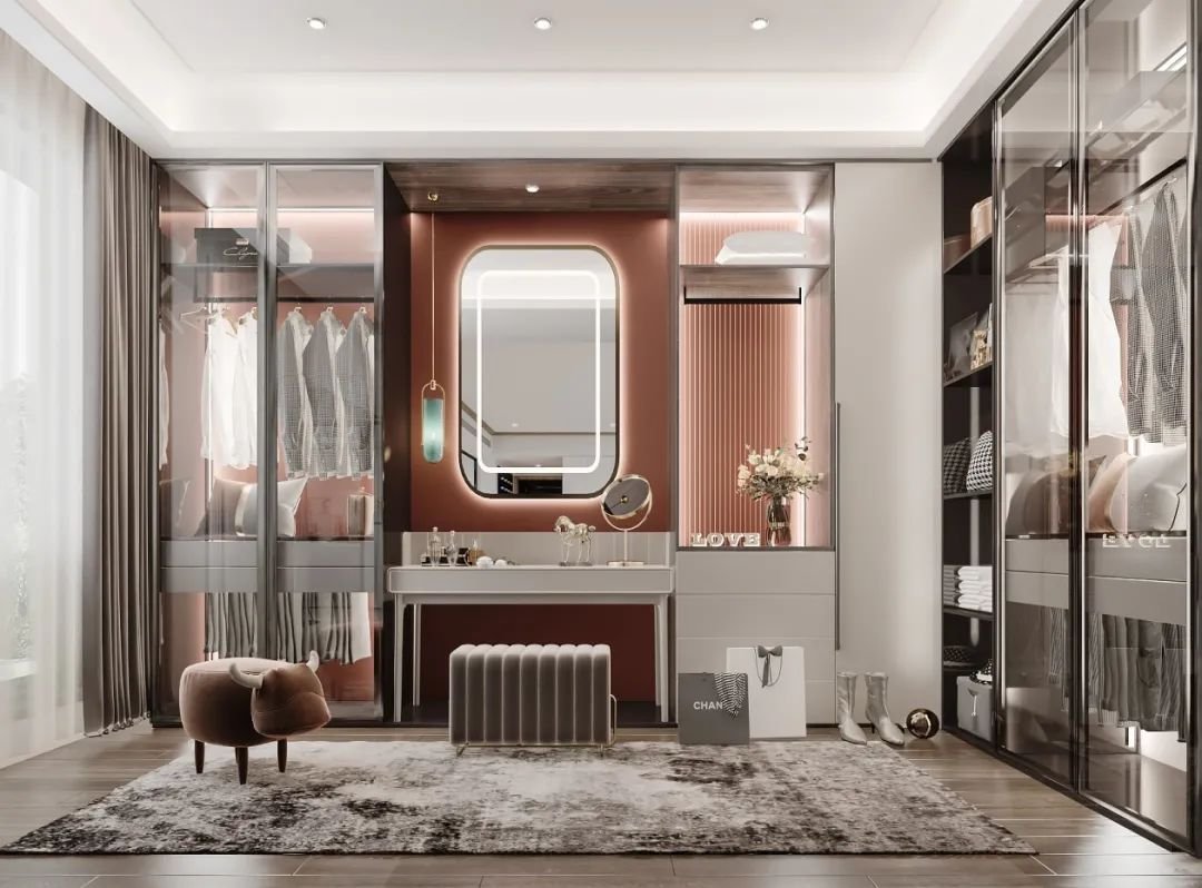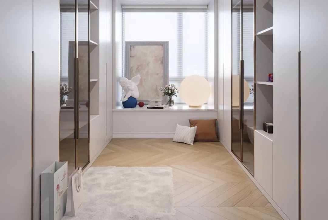 相比于房間內(nèi)大大小小的柜子,衣帽間的優(yōu)勢非常明顯:做到服裝飾品的集中收納,減少過多瑣碎物件對房間的瓜分,空間視覺感更清爽,同時使用率也大大提高。