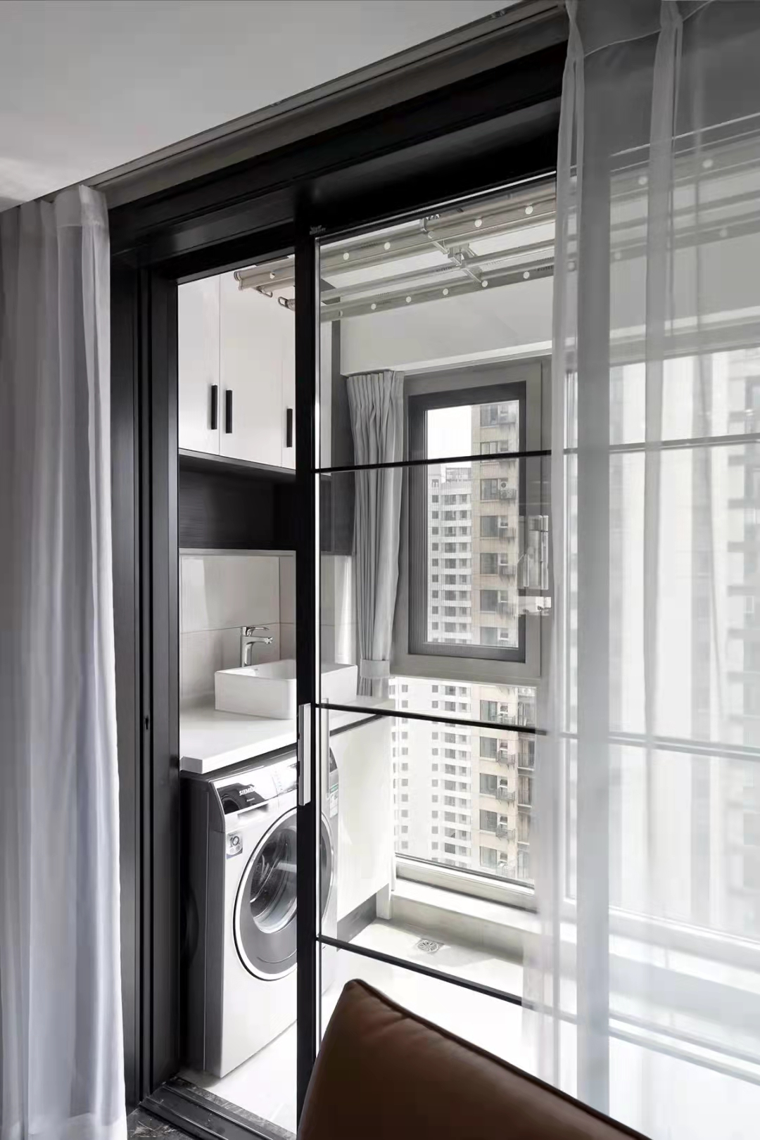 a.陽(yáng)臺(tái)側(cè)邊裝上收納柜和洗衣機(jī),在陽(yáng)臺(tái)的兩端加上屏風(fēng)隔斷,這樣保持空間通透又美觀,也是不錯(cuò)的選擇。