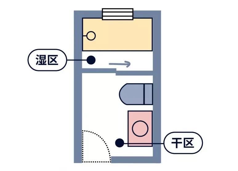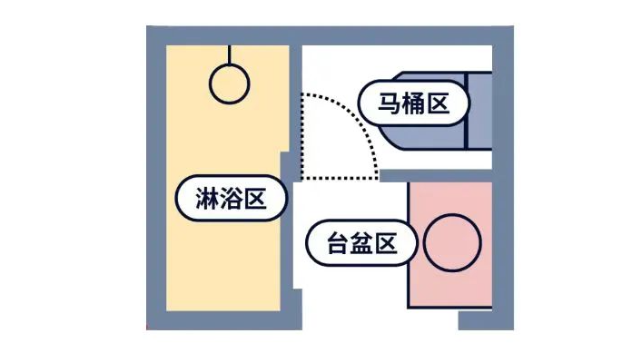 另一種使用率最高的布局方式就是兩分離,濕區(qū)(淋浴區(qū))、干區(qū)分開(kāi)(馬桶區(qū)+臺(tái)盆區(qū))。相對(duì)來(lái)說(shuō),很多家庭都是小戶型,兩分離更適用,可選擇性較大。