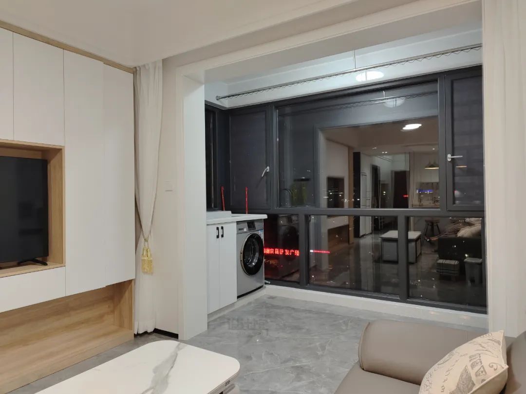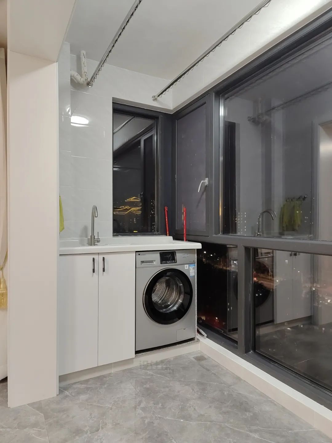 陽(yáng)臺(tái)做成開放式,那么曬衣物的問題也來了,對(duì)于家里不常來客人的話,那么陽(yáng)臺(tái)納入客廳,直接曬衣物也是沒關(guān)系的;如果追求美觀的空間,不想在客廳看到晾曬的衣物,也可以采取洗衣機(jī)+烘干機(jī)的組合,就我接觸的很多年輕客戶中,也是有不少人是習(xí)慣用烘干機(jī)烘衣物的。