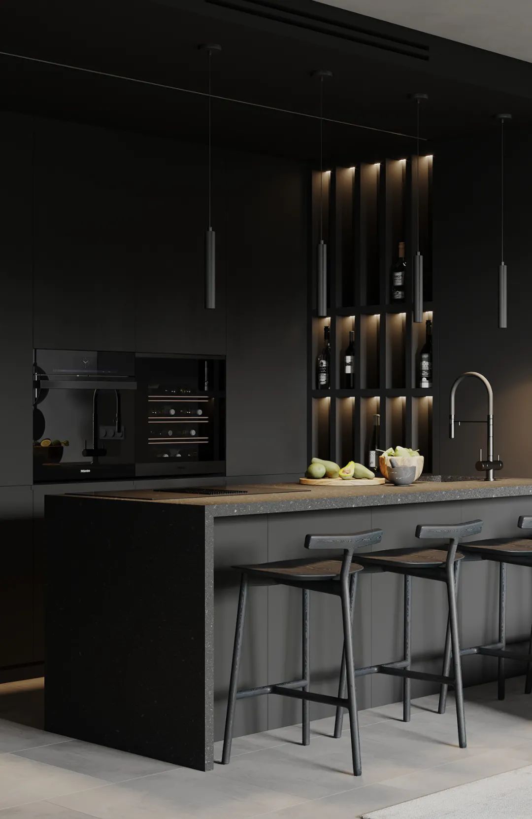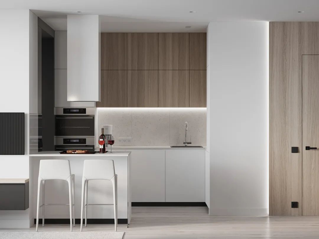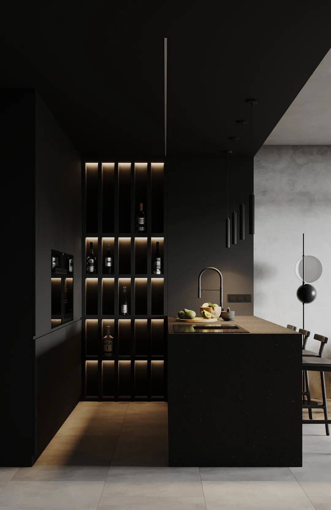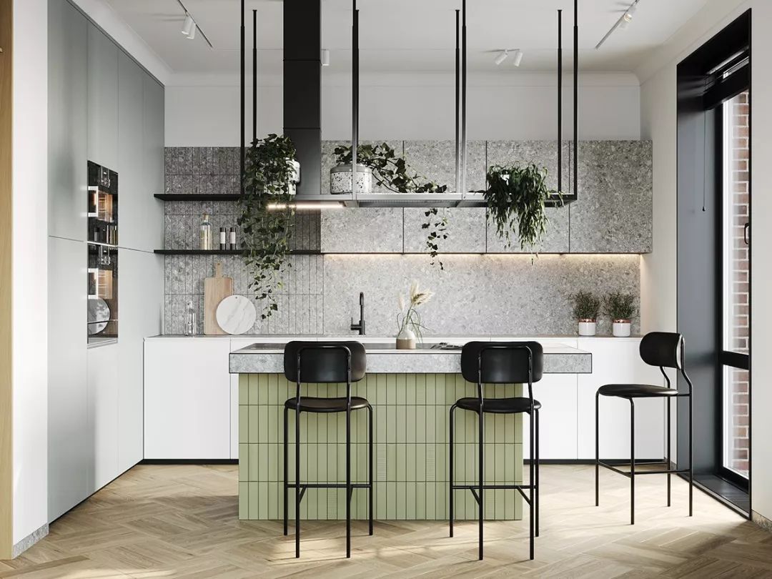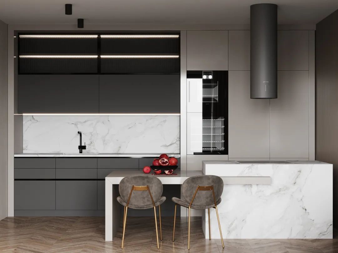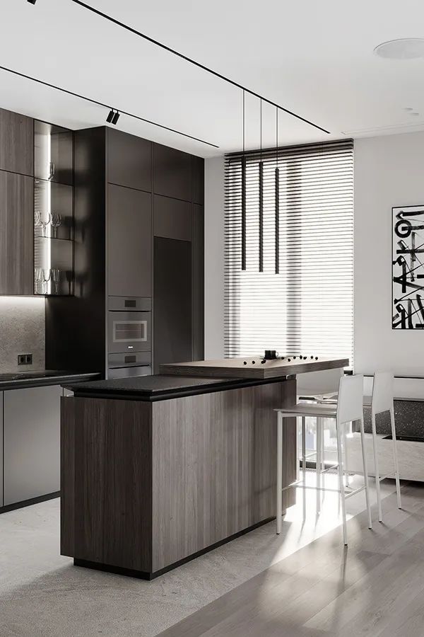 利用吧臺底部空間,不管是內(nèi)嵌廚房電器,還是做儲物柜都很合適。