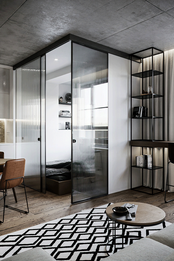 小戶型一般都只有一個臥室,因此,如果臥室墻體非承重墻,可動的話,將實墻打掉換成玻璃隔斷,就是一個很好的選擇。