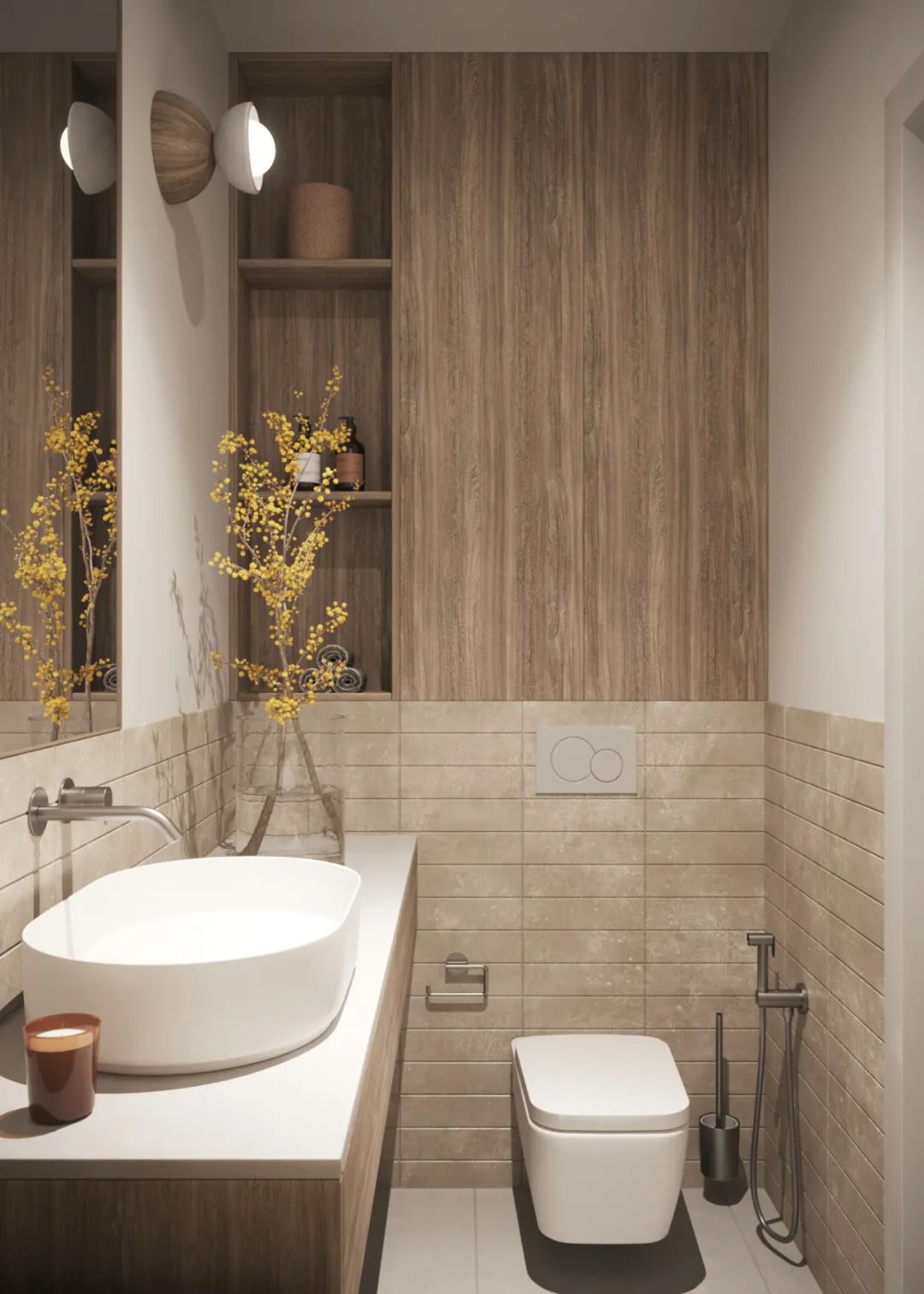 衛(wèi)生間的設(shè)計也不要選用復雜的裝飾,選擇壁掛馬桶、懸掛式浴室柜等一系列不留清潔死角的就行了。