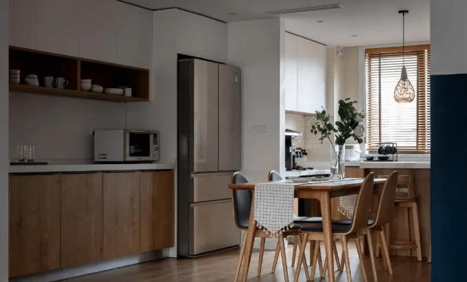 廚房采用開(kāi)放式設(shè)計(jì)能夠盡可能的保留其他房間的自然光,減少房間與房間之間的區(qū)域獨(dú)立性,增強(qiáng)整體感,能極大程度的環(huán)節(jié)狹長(zhǎng)型空間的局促感。 當(dāng)然,如果習(xí)慣爆炒,擔(dān)心開(kāi)放式廚房會(huì)讓油煙跑得到處都是的話,也可以做半開(kāi)放式設(shè)計(jì),用玻璃移門做隔斷,隔油煙,同時(shí)也不影響采光。