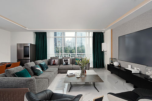 既然客廳的面積有限,就不要在設(shè)置不可要的隔斷增加空間的負(fù)累,通過墻壁材質(zhì)的不同,提示會(huì)客、用餐區(qū)域的功能區(qū)分,一目了然,給空間寶貴的通透感,如果客廳的盡頭,擁有采光良好的落地窗,那不僅可以提升居室的美感,還具有延伸視線的效果,選擇輕盈、素雅的窗簾,與干凈、內(nèi)斂的整體風(fēng)格相融合。