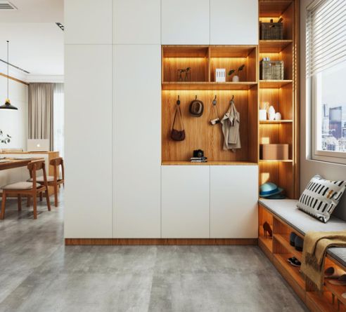 在玄關(guān)處定制卡座代替換鞋凳,下面做成開(kāi)放格,不用開(kāi)合柜門(mén),就可以直接脫鞋換鞋。閉合式設(shè)計(jì)也可以收納鞋油、鞋刷等物品,方便出門(mén)時(shí)打理。相比于獨(dú)立的換鞋凳來(lái)說(shuō),卡座設(shè)計(jì)在視覺(jué)上也更完整統(tǒng)一,可以給客人留下一個(gè)好的第一印象。