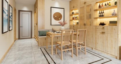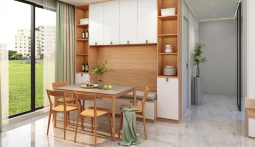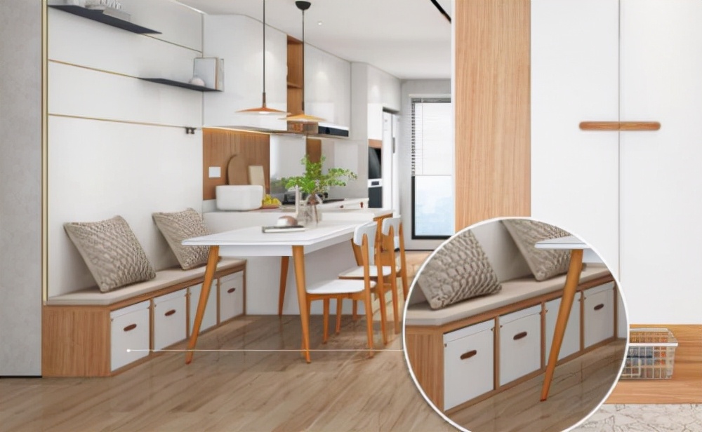 除了獨(dú)立卡座,還可以和將卡座內(nèi)嵌入餐邊柜,做一體式設(shè)計(jì)。頂部定制吊柜,增加了儲(chǔ)物量,兩側(cè)就做成開(kāi)放式儲(chǔ)物柜,存放盤(pán)子、杯子等物品。但是要注意,吊柜的深度要比卡座淺一些,防止起身撞頭。