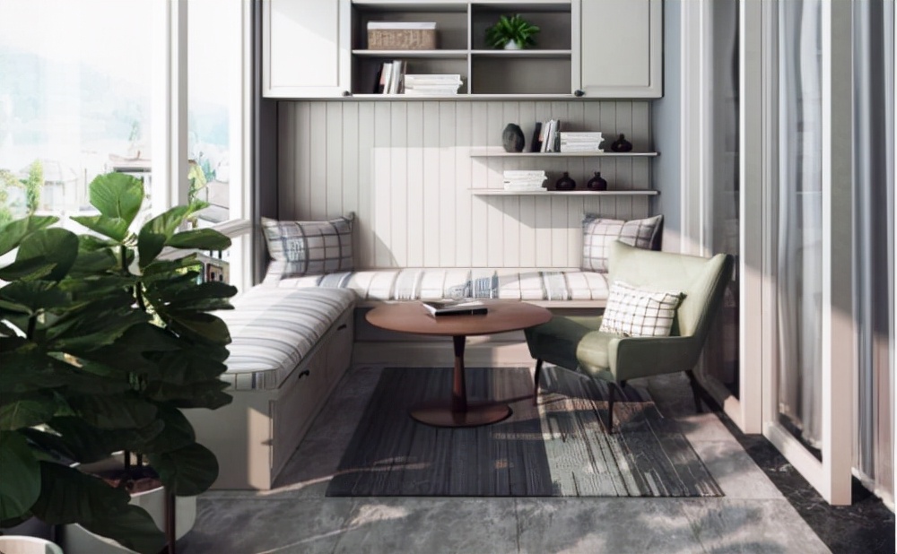 如果空間夠大,還可以定制“L”型卡座,擴(kuò)大休閑區(qū)域,配以桌子、綠植,再定制吊柜增加收納,陽(yáng)臺(tái)就變成了一個(gè)獨(dú)立的會(huì)客室,成為家里的一道靚麗風(fēng)景線(xiàn),時(shí)不時(shí)請(qǐng)三五好友來(lái)閑聊暢玩,享受歡愉的休閑時(shí)光。