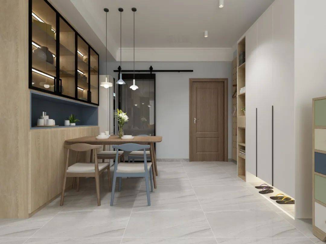 鞋柜沿著餐邊的墻體擺放,與電視柜、餐邊柜等家具連成一體,整面墻都做一整排的柜體,這樣做的空間感簡(jiǎn)潔大方,也是一個(gè)不錯(cuò)的方案。