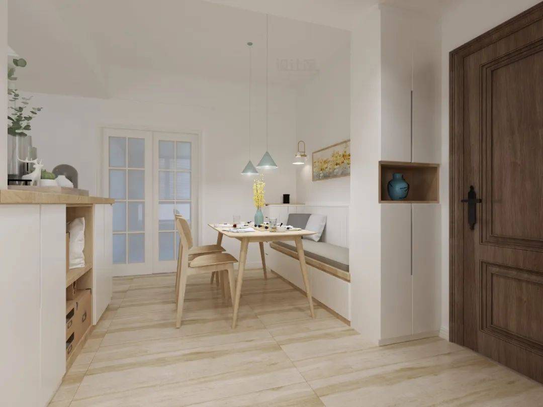 如果大門(mén)與短邊墻之間有足夠的距離(一般是30cm以上,鞋柜厚度需要30cm以上的空間),就可以考慮把鞋柜裝在門(mén)后的短邊墻,這樣布置的好處是可以把門(mén)后的邊角空間利用起來(lái),并且鞋柜不會(huì)影響到客廳、餐廳區(qū)域的布置利用。