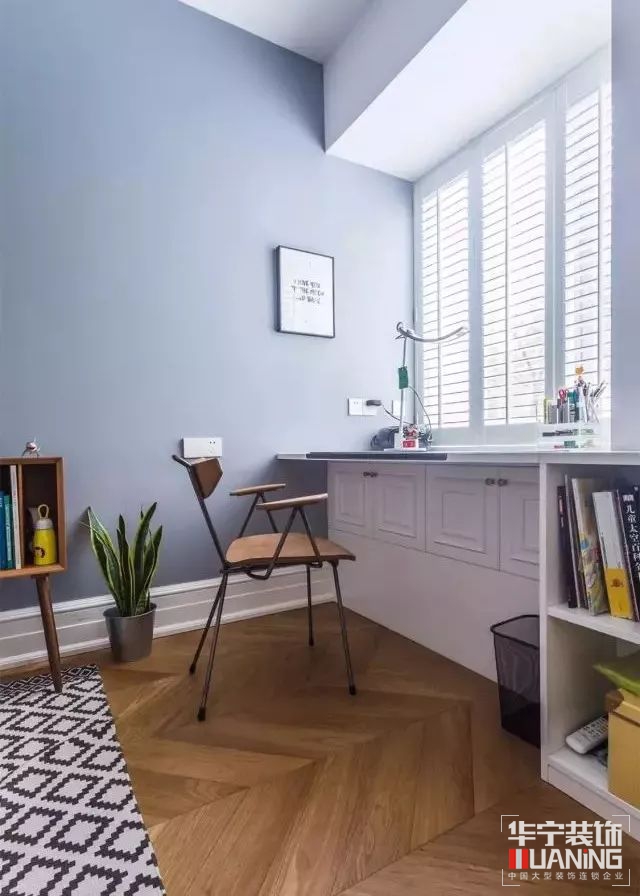直接大方地在窗邊設(shè)計(jì)張書桌,窗簾使用百葉窗,小清新又有情調(diào)。