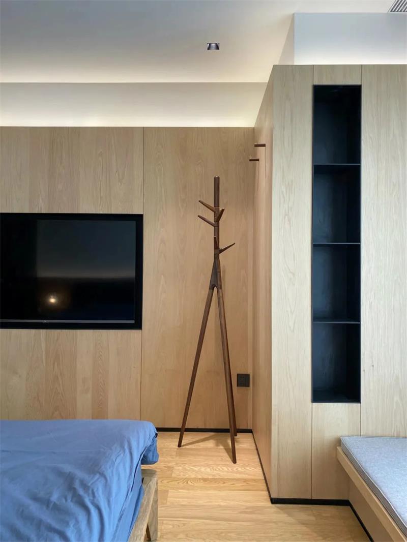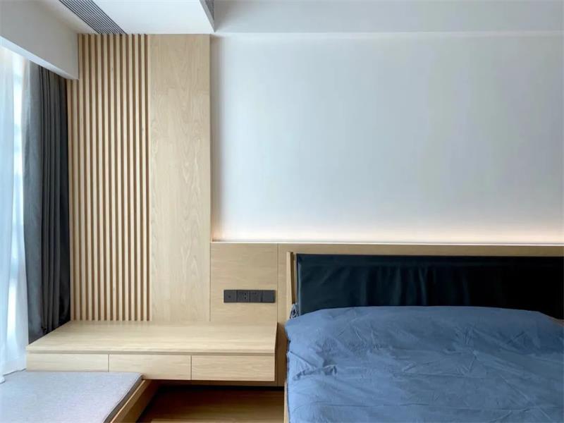 臥室床頭墻、天花等空間都是凈白的設(shè)計(jì),側(cè)邊加入木飾面、長(zhǎng)城板,還有灰綠色的床單,使得臥室空間充滿簡(jiǎn)約自然的愜意感。
