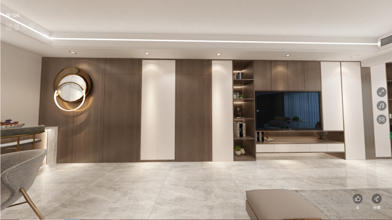 木飾面與定制柜融為一體的電視墻設(shè)計(jì),電視機(jī)嵌入安裝在中間的留空格里,顯得簡(jiǎn)約自然而大氣?;疑ど嘲l(fā),還有圓形組合的茶幾,也營(yíng)造出一種現(xiàn)代優(yōu)雅的客廳氛圍感。