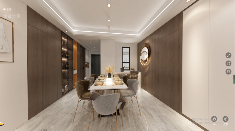 餐廳區(qū)域的兩邊均用木飾面裝飾,還加入了酒柜,布置展示品提升空間的華麗感。中間黑色的餐桌以白色大理石為臺(tái)面,搭配上深色布藝坐墊的餐椅,也營(yíng)造出一個(gè)端莊優(yōu)雅的用餐空間。