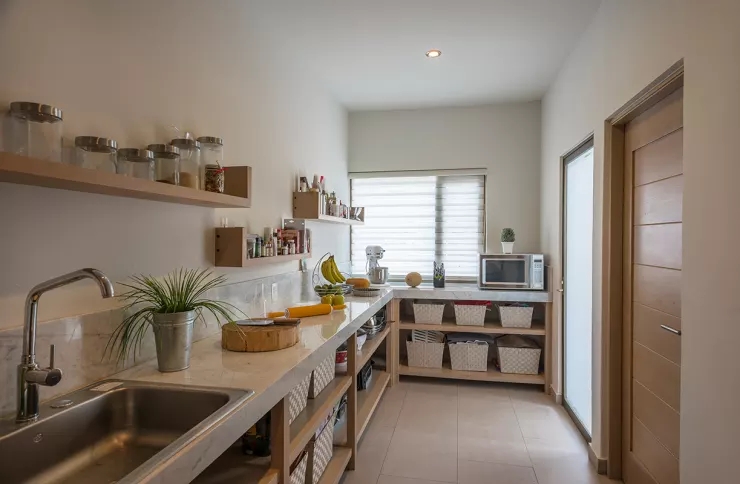 這里的收納是開(kāi)放式的,應(yīng)該說(shuō)是半開(kāi)放式,在開(kāi)放的層架裡擺上分門別類用的籃子,再簡(jiǎn)單不過(guò)了。記得選用干凈、統(tǒng)一的籃子,市面上各種尺寸也很多,價(jià)錢也不貴,還隨時(shí)可以更換。而且其實(shí),越小的廚房,這種設(shè)計(jì)會(huì)越好看,甚至有延伸視覺(jué)的功能,是不是很聰明呢!