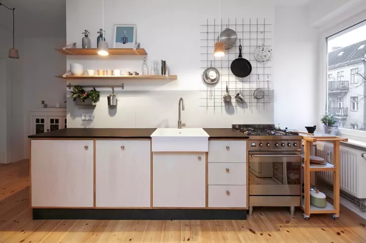 格子網(wǎng)架非常好用。在空間不大的廚房里,這樣的網(wǎng)架可以掛在墻上,有效率的收納你的廚具和五金,而且還讓你的廚房有了與眾不同的手工風(fēng)格。這個(gè)案例裡在一旁也盯上了層板,相輔相成又簡(jiǎn)潔。不過(guò)要注意的是,這麼顯而易見(jiàn)的收納方式,一定要把東西掛得整整齊齊才不雜亂喔!