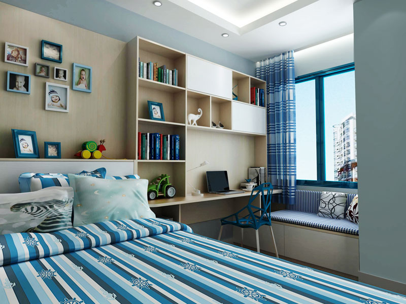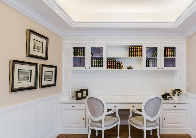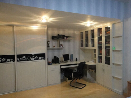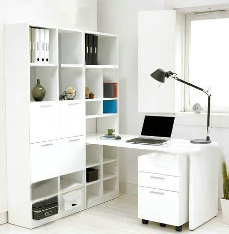 3、若是轉(zhuǎn)角的一體書(shū)桌書(shū)柜組合設(shè)計(jì),雖然占據(jù)一些空間,確多了一點(diǎn)柔和,整齊柜格相搭配,獨(dú)具特色。