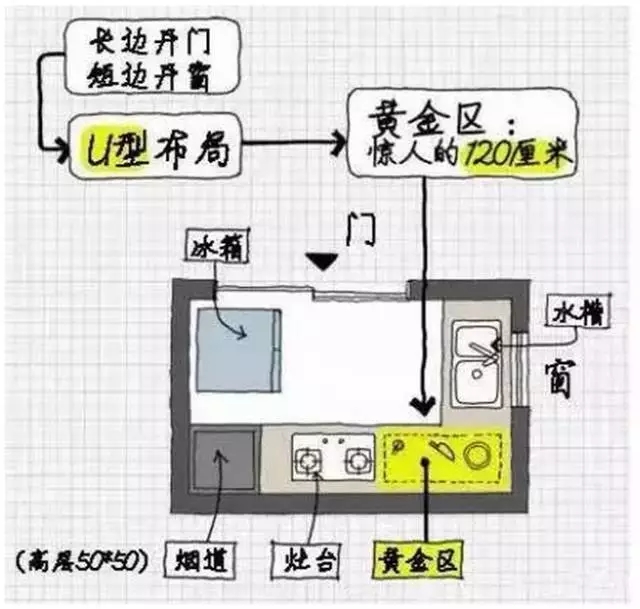黃金區(qū)是放菜板、菜刀、切菜的區(qū)域, 活兒最多,東西也最多,同等面積的廚房,黃金區(qū)也最大,U型布局黃金區(qū)可增加3倍以上。