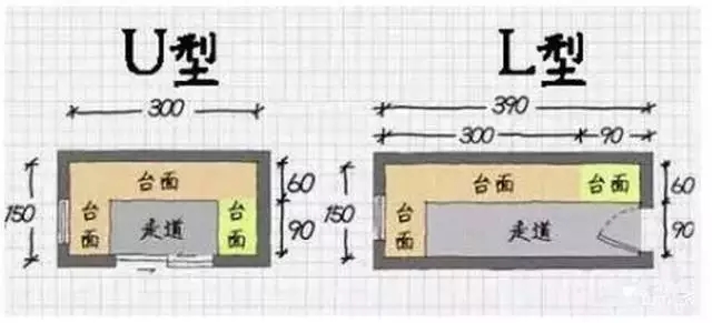 中小廚房最好采用U型布局,因?yàn)椤跋?切-炒”流線順暢,當(dāng)然還有更重要的優(yōu)勢,舉個(gè)例子,某兩個(gè)小廚房(如下圖),兩種布局, 廚房面積差距超30%,而臺面面積居然相同!