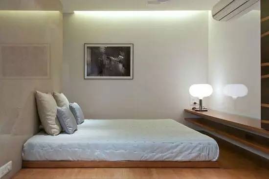 深色的木質(zhì)地臺(tái)搭配簡單且厚重的床墊,簡單大方的墻面沒有任何裝飾。