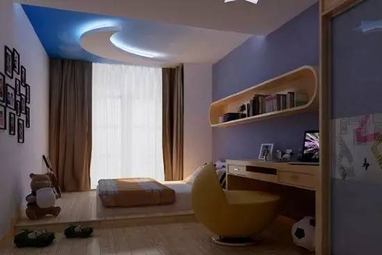 這個(gè)兒童房就采用了榻榻米的設(shè)計(jì)方式,吊頂就選擇星星和月亮為圖形。