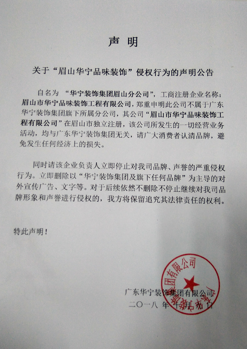 關(guān)于華寧裝飾集團(tuán)對“眉山華寧”的聲明公告