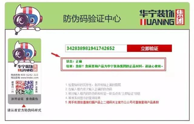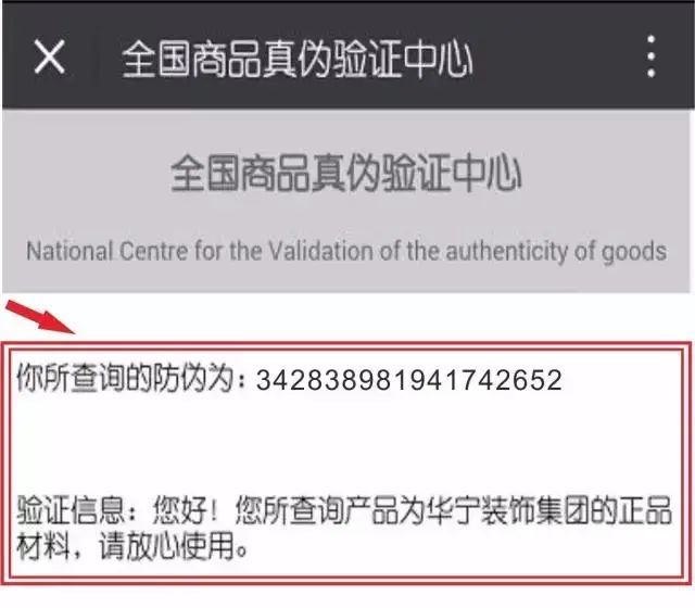 第3步:系統(tǒng)驗(yàn)證提示:您好!您所查詢(xún)產(chǎn)品為華寧裝飾集團(tuán)的正品材料,請(qǐng)放心使用。即完成驗(yàn)證。