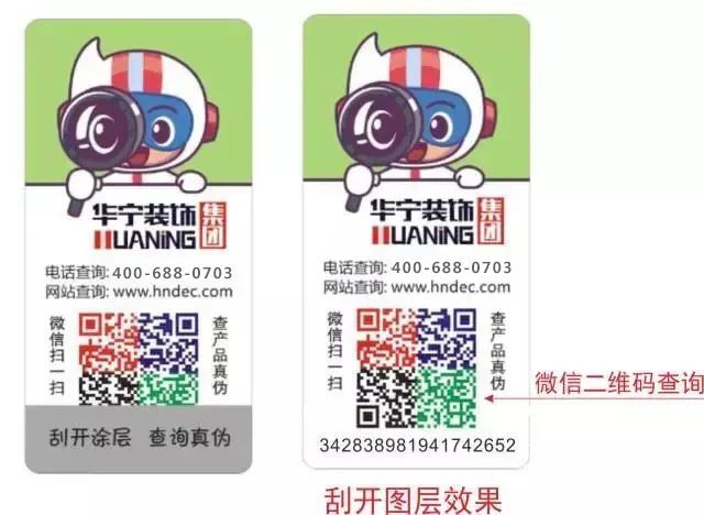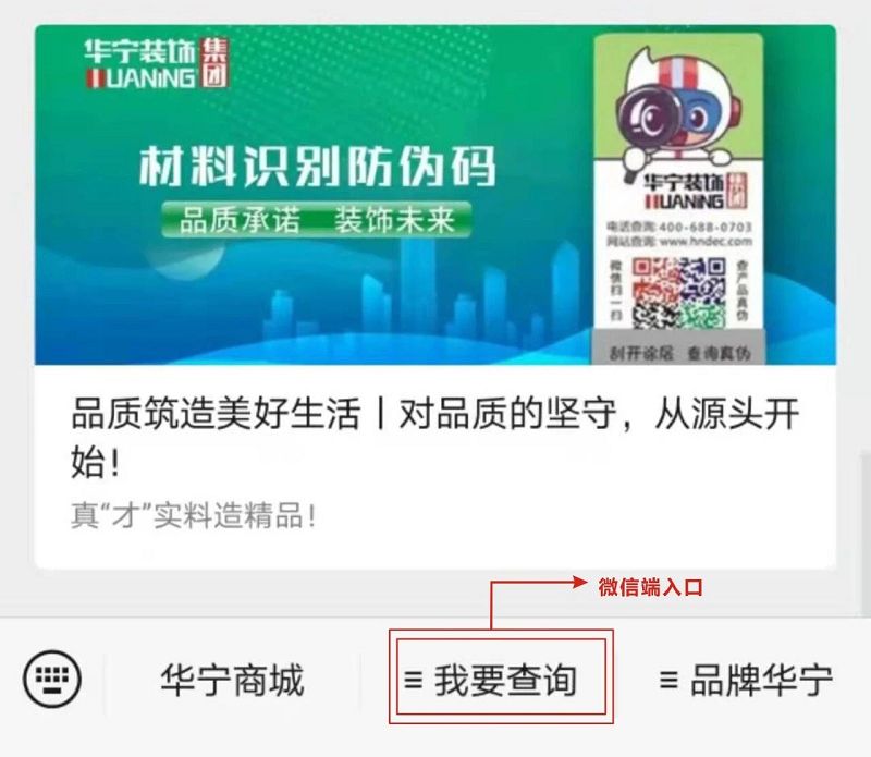 “寧寧防偽碼”查詢(xún)方式有官方微信、官網(wǎng)與電話驗(yàn)證三種方式,消費(fèi)者可多角度全方位立體查詢(xún),確保所用材料為華寧裝飾集團(tuán)的正品,杜絕任何假冒偽劣產(chǎn)品。