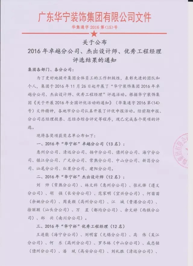 為了更好地提升集團全體員工的工作積極性,表彰先進的團隊和個人,集團于2016年11月26日起開展了“華寧裝飾集團2016年卓越分公司、杰出設計師、優(yōu)秀工程經(jīng)理”評選活動。根據(jù)華寧裝飾集團《關(guān)于開展2016年全國評優(yōu)活動的通知》(華集通字2016第<14>號)文件精神,各地市分公司認真開展了評優(yōu)申報活動。經(jīng)前期申報、分公司總經(jīng)理投票、總經(jīng)辦綜合評定等程序,現(xiàn)已完成各個獎項的評選。