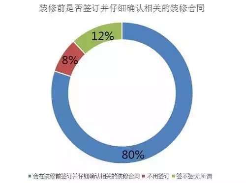 在此項(xiàng)調(diào)查中,我們可以發(fā)現(xiàn)80%的業(yè)主已經(jīng)有裝修合同簽訂的概念,但仍有20%的業(yè)主在這方面仍缺乏安全意識(shí),裝修合同的簽訂對雙方履行合同內(nèi)容十分重要,這點(diǎn)業(yè)主們需要引起注意。