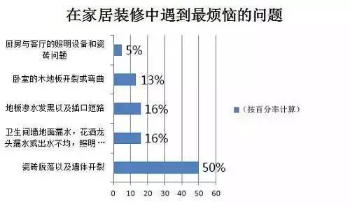 根據(jù)圖中可以看見“瓷磚脫落以及墻體開裂”問題嚴(yán)重,達(dá)到了最高的50%,“木板開裂”、“漏水、照明、電路”問題占據(jù)了剩下的50%。這點(diǎn)可以看出施工隊(duì)伍的專業(yè)性對于家裝來說至關(guān)重要,在家裝中需要引起注意。