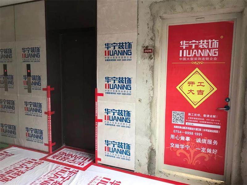 華寧裝飾的裝修工地大門保護套的正面帶有“開工大吉”的字樣,門鎖位置摳出鑰匙的位置,便于開鎖;把手單獨包起來,以免磨損臟污。