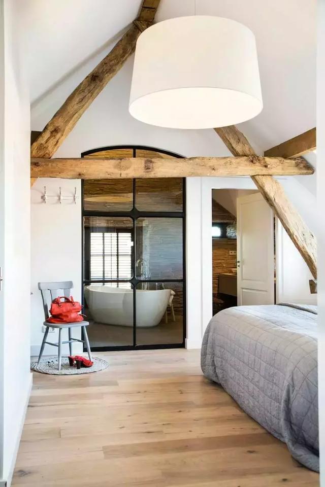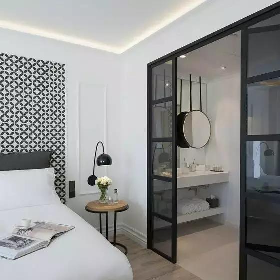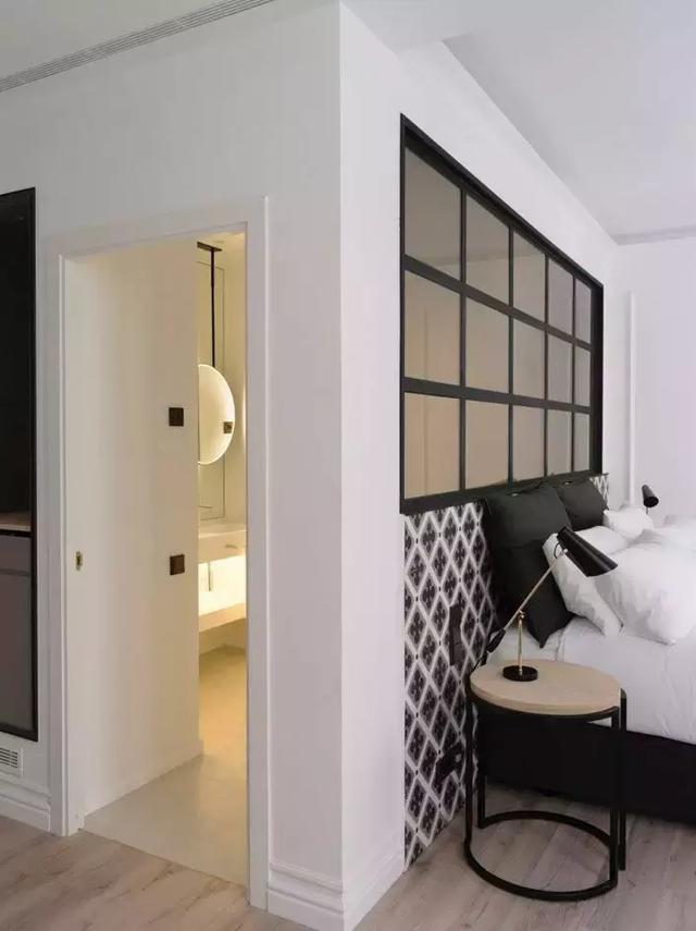 用黑框玻璃窗來(lái)阻斷衛(wèi)生間與臥室的界限,不僅可以解決暗衛(wèi)本身存在的采光問(wèn)題,而且視覺(jué)上更具時(shí)尚效果,令整個(gè)臥室的質(zhì)感瞬間提升。