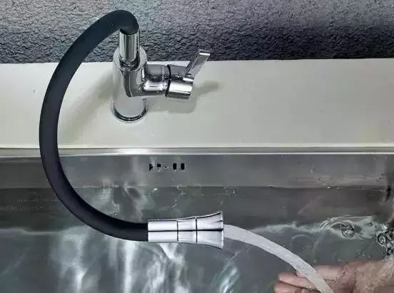 選擇萬向旋轉的水龍頭,避免被濺射同時可任意角度徹底清潔水盆。水槽上方安裝橫桿,方便抹布、洗碗布等小物件的收納。灶臺上方預留水龍頭+軟管,炒菜、燉湯龍頭一開直接往鍋里加水,不用端來端去。