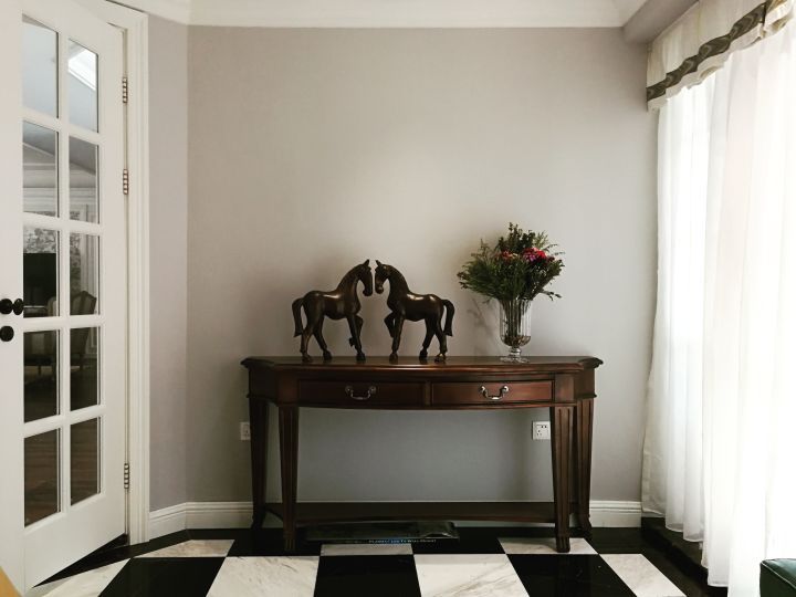 玄關(guān)門廳采用簡單的裝飾,沒有復(fù)雜多余的點綴。僅僅只用簡單的黑白磚,營造出西洋棋的感覺。古樸的柜子和擺件都十分具有歐美的感覺。