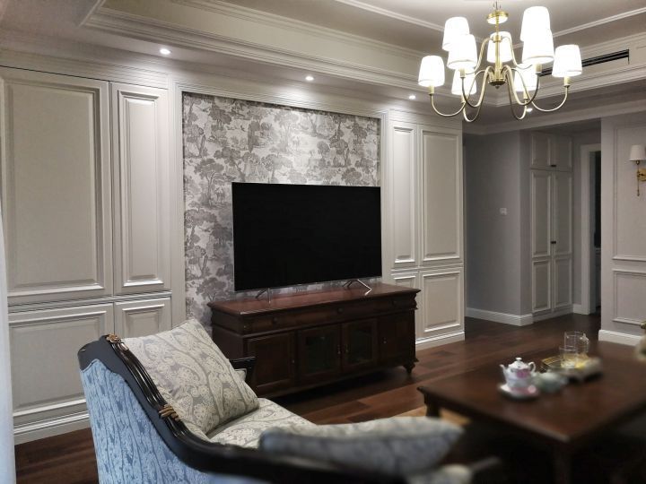 墻紙選用了中式復(fù)古的花紋,這種暖色的壁紙并不會顯得十分突兀正好和家具擺設(shè)互相輝映。架設(shè)壁爐更顯歐美的感覺。