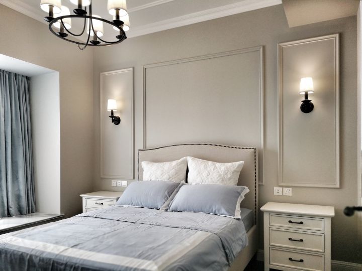 臥室采光十分好,沒有大量裝飾。壁燈簡約輕容,床頭柜也十分的簡單。優(yōu)雅的灰色給人安靜祥和的氛圍。