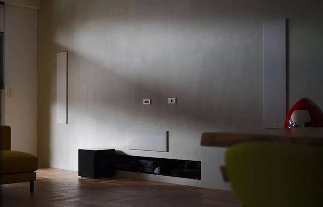 ▲簡(jiǎn)潔的電視墻里加入了一個(gè)投影幕布,頂上留了一排的藏光燈槽,讓客廳顯得層次而溫馨感。