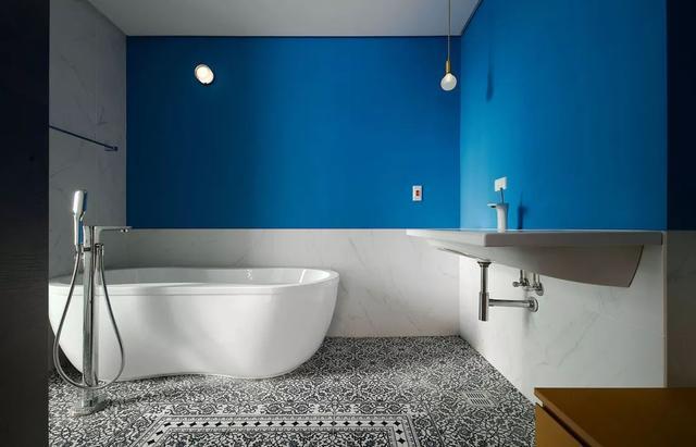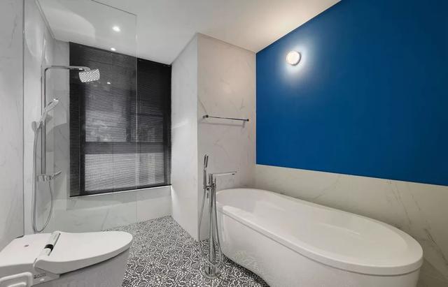▲衛(wèi)生間地面是花磚,搭配雅白墻面磚,墻身是刷成深藍(lán)色的防水漆,布置了浴缸與淋浴房,整個(gè)衛(wèi)生間空間顯得簡(jiǎn)潔優(yōu)雅好大方。