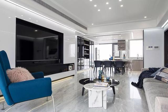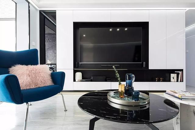 ▲現(xiàn)代風格的客廳,白色大理石質(zhì)感的地面基礎,天花上是幾個光點,搭配淺灰色布藝沙發(fā)、黑白配的圓形大理石茶幾、藍色休閑椅,整個空間顯得自然大方而優(yōu)雅。