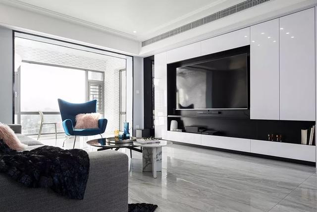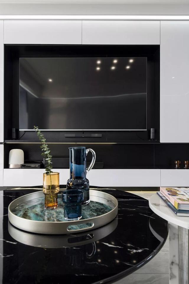▲黑白配的電視墻,以白色柜體+黑色背景與電視機,營造出一個實用時尚的設計。
