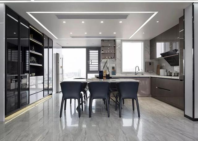 ▲餐廚空間的天花板也是沒有主燈的設計,在做平的天花里留出筒燈+一圈燈光線的造型,簡潔時尚好大氣。香檳色的櫥柜搭配在開放的餐廚空間里顯得端莊華麗。