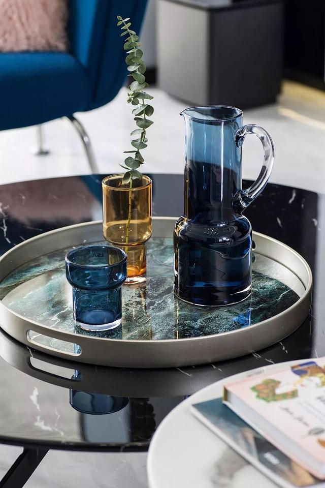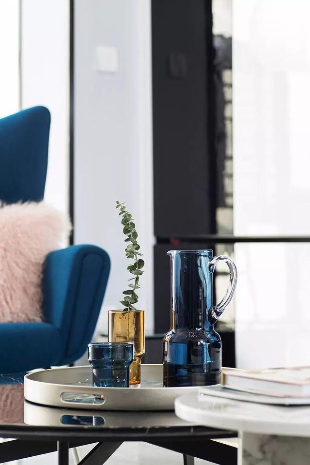 ▲茶幾上精致的藍色與棕色玻璃瓶布置,添增了空間的高檔氣質(zhì)。