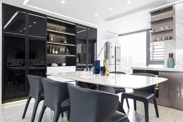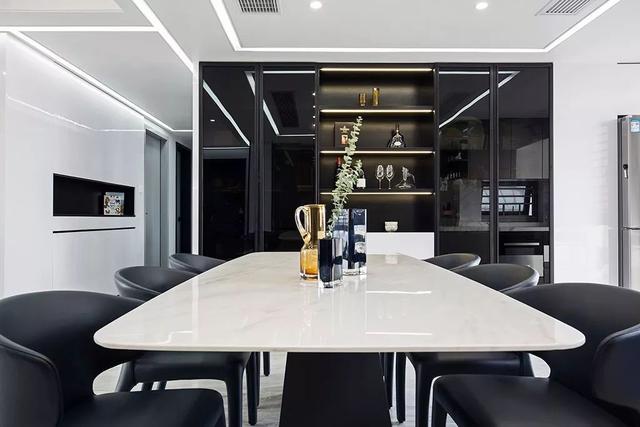 ▲大理石質(zhì)感的餐桌臺面,結合深灰色皮質(zhì)餐椅,餐桌上還有精致的花瓶擺飾,餐廳背景墻上的酒架與燈飾,也顯得端莊而輕奢。
