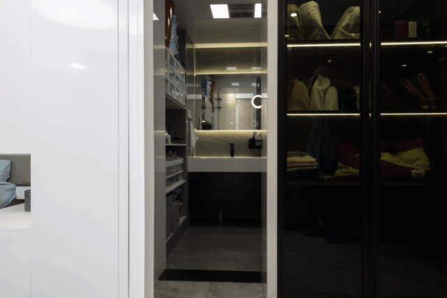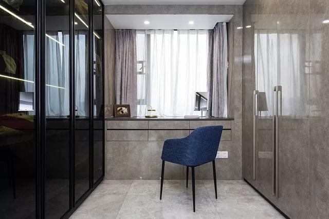 ▲衣帽間的柜體面板與地面磚一樣的灰色調(diào),另一側的柜子是采用玻璃門的設計,用于存放經(jīng)常更換的衣物,找衣服的時候就方便了不少。