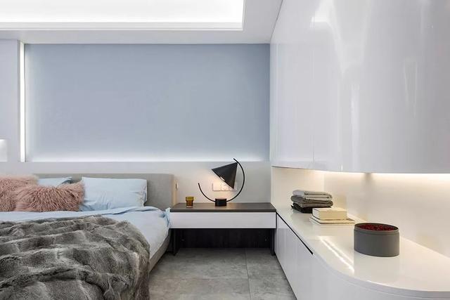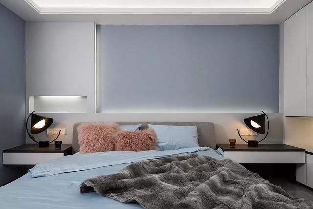 ▲藍色調(diào)的臥室,床頭墻是一個凹槽造型,還做了燈帶裝飾,顯得層次而又華麗。側邊的柜體也是留空了一層格層,方便常用物品的擺放。