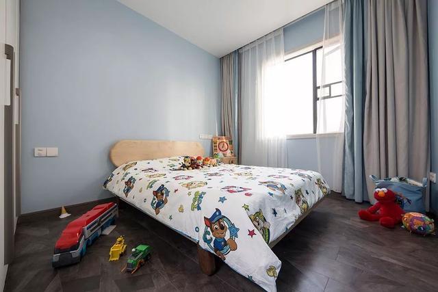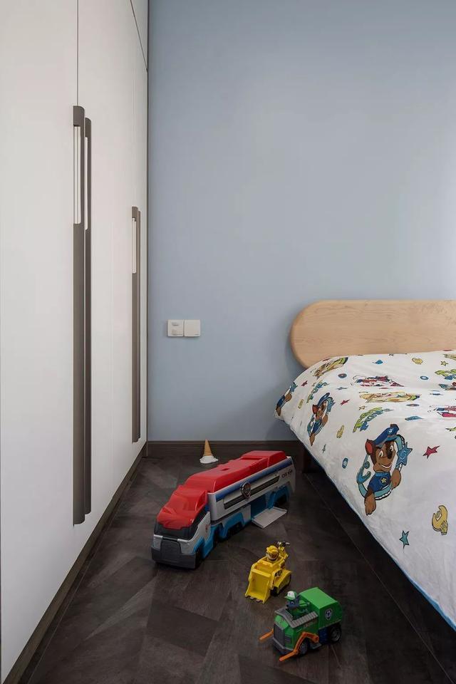 ▲兒童房在淡藍色的空間基礎,結合一張木質(zhì)床與童趣的的床單玩具,充滿了活潑的氣質(zhì)感。