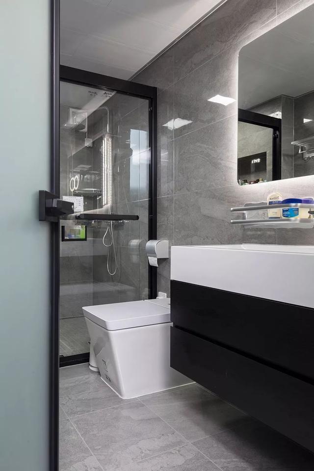 ▲衛(wèi)生間在灰色調(diào)的墻面地面磚,結合黑白配的衛(wèi)浴設計,整體顯得簡潔時尚。