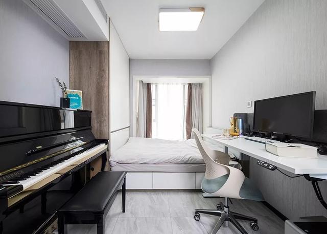 ▲書房布置了書桌與鋼琴,靠窗定制的床與衣柜組合,帶來的是一個實用舒適的空間感。