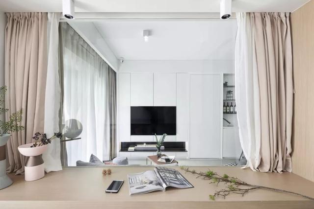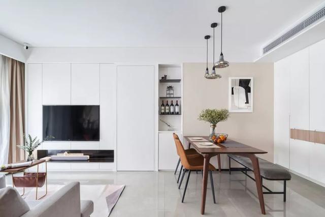 ▲電視墻與餐廳墻中間有個(gè)門洞,通往臥室的門,即是隱形門,這樣的門與電視柜結(jié)合設(shè)計(jì),有效解決了電視墻有門洞的問題。